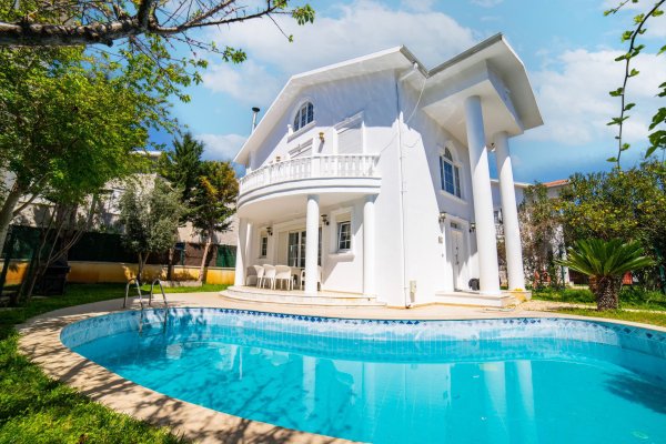 The villa's price includes new furniture, a fitted kitchen, household appliances, air conditioning, heated floors, LED lighting, fully equipped bathrooms, and more. On the premises, you'll find a large outdoor swimming pool, a relaxation terrace, and parking facilities.
